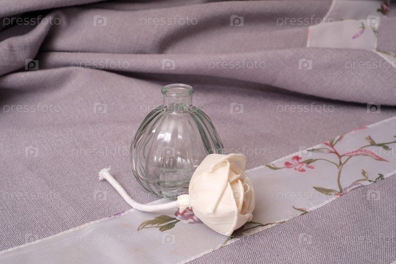 Натюрморт со стеклянным незаменимым внутренним диффузором и тканевым цветочным фитильом на декоративном текстиле