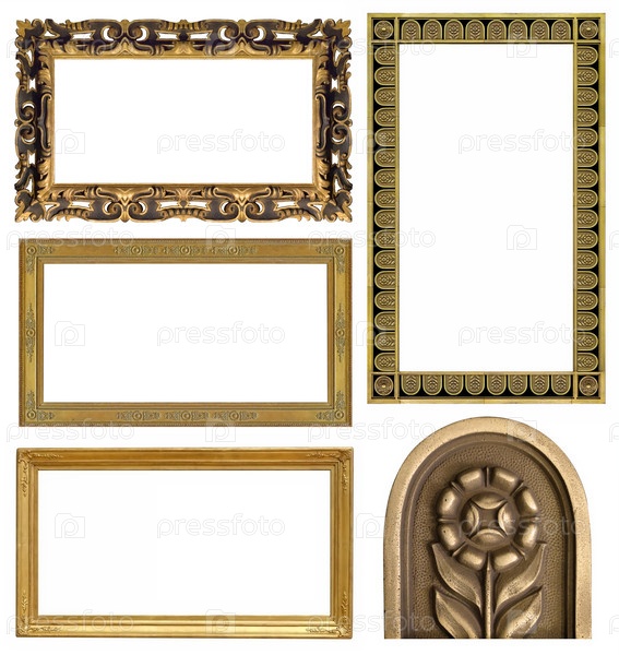 Набор золотых рамок для картин, зеркал или фотографий, изолированных на белом фоне