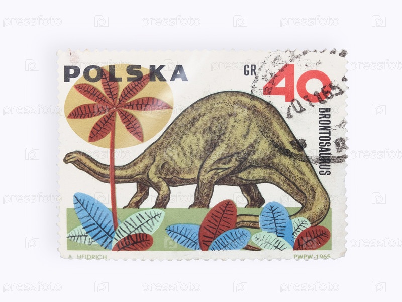 Почтовая марка Польши с изображением доисторического животного (бронтозавра), изолированного на белом фоне