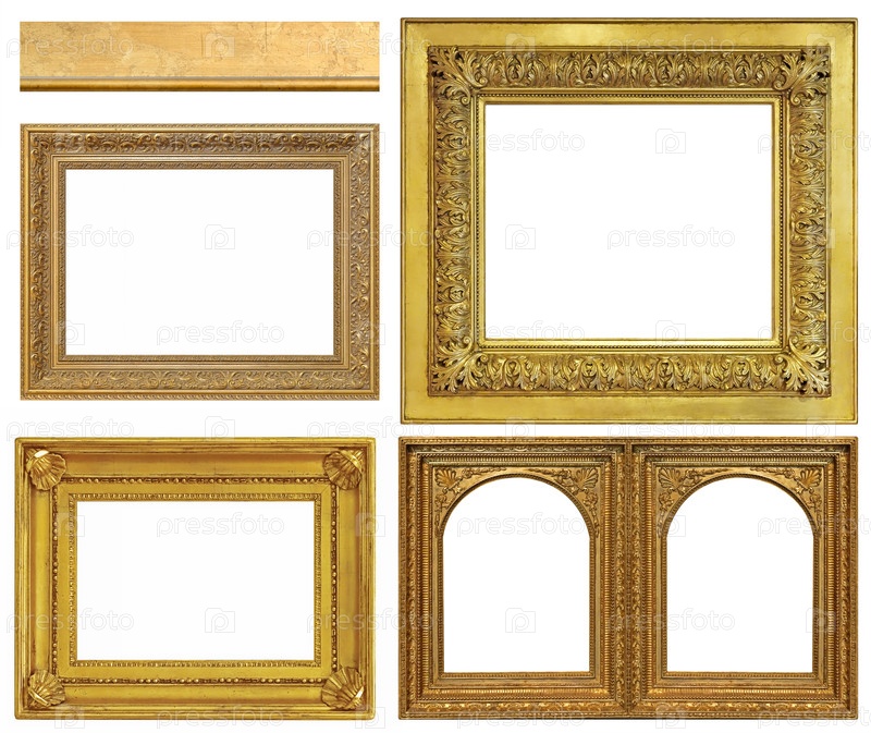 Набор золотых рамок для картин, зеркал или фотографий, изолированных на белом фоне