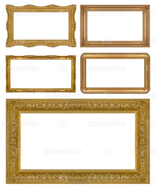 Набор золотых рамок для картин, зеркал или фотографий, изолированных на белом фоне