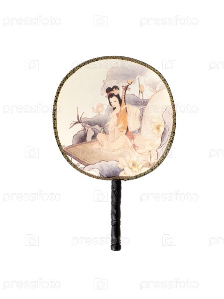 Китайский шелковый вентилятор с традиционным орнаментом изолирован на белом фоне