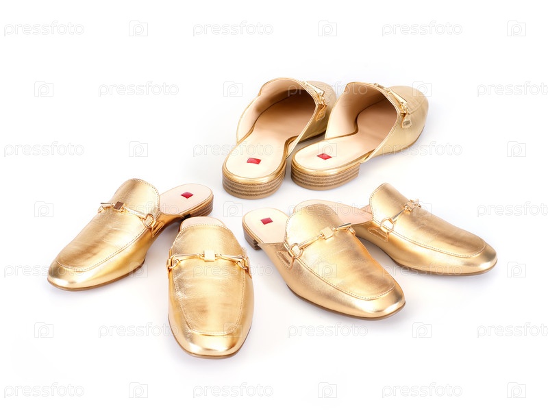 Золотые кожаные мулы изолированы на белом фоне