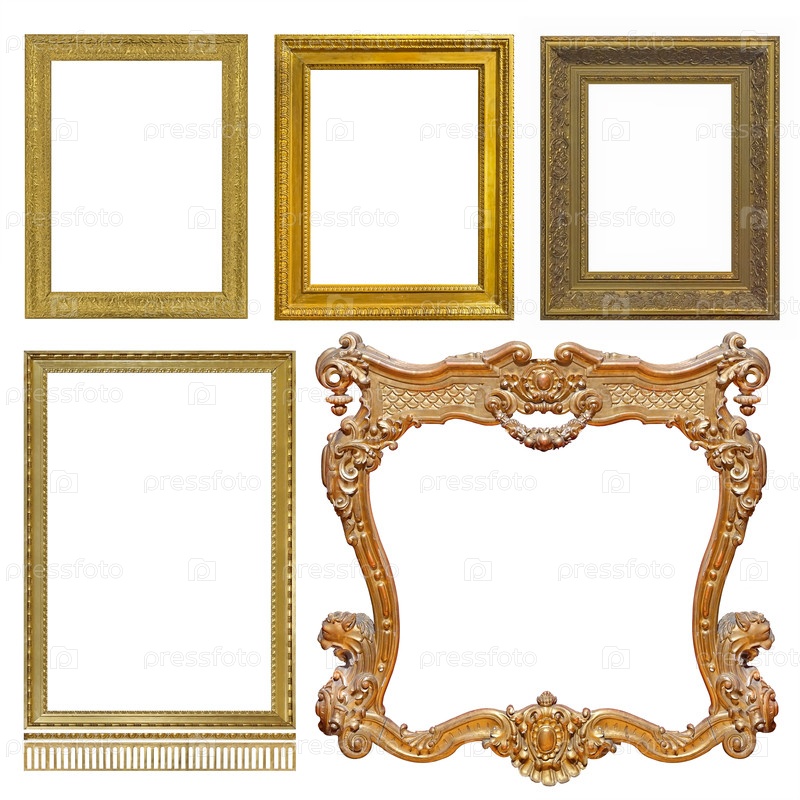 Набор золотых рамок для картин, зеркал или фотографий, изолированных на белом фоне