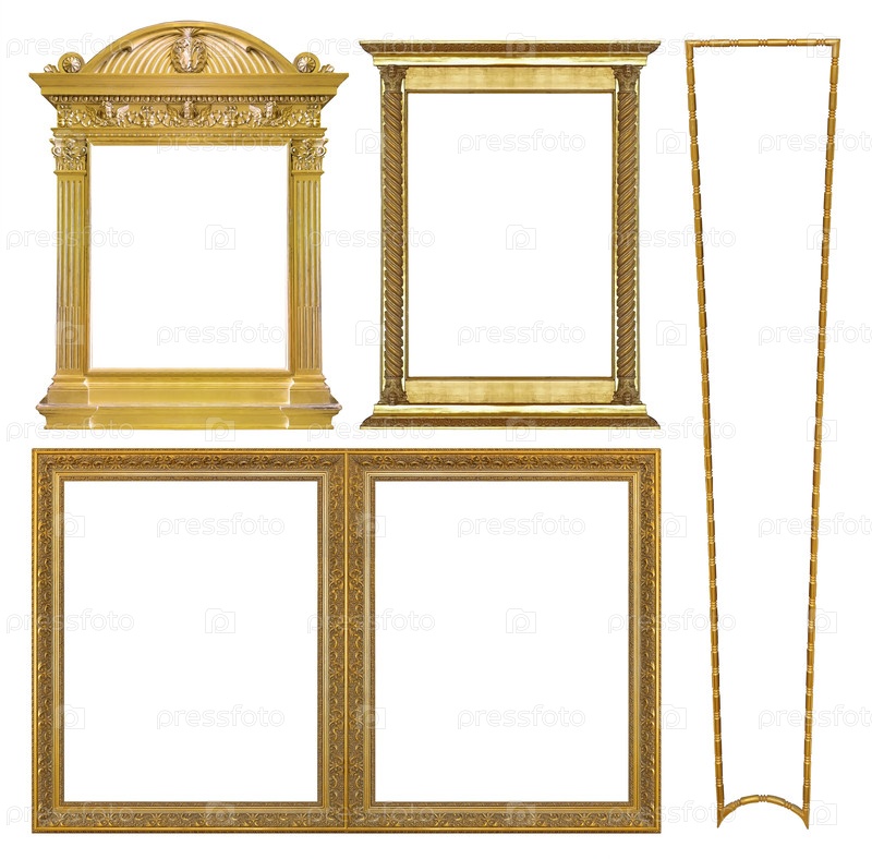 Набор золотых рамок для картин, зеркал или фотографий, изолированных на белом фоне