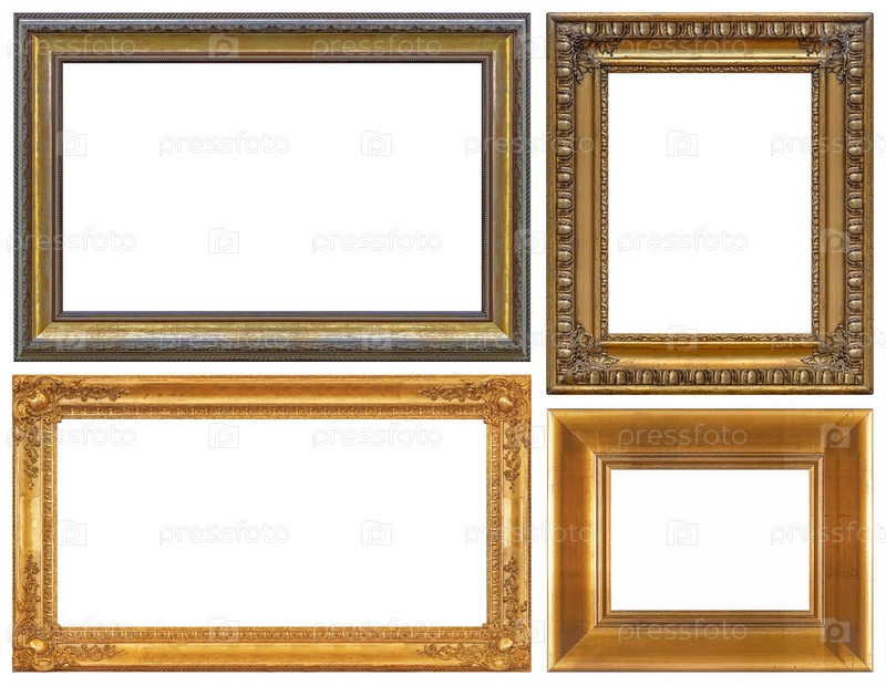 Набор золотых рамок для картин, зеркал или фотографий, изолированных на белом фоне