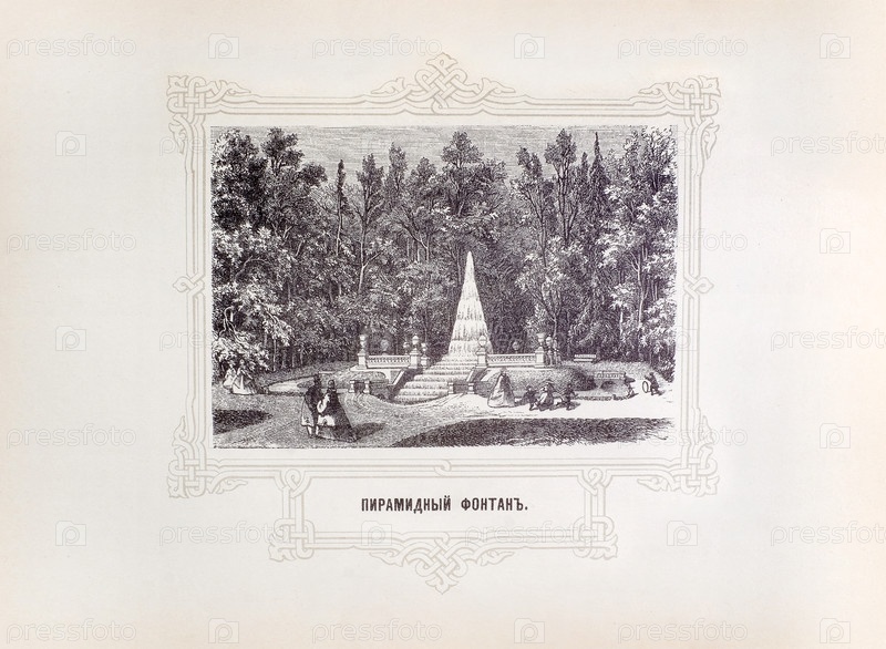 Книга 1868 года 'Описание Петергофа', автор Александр Гейрот. Гравюра 'Пирамидный фонтан'