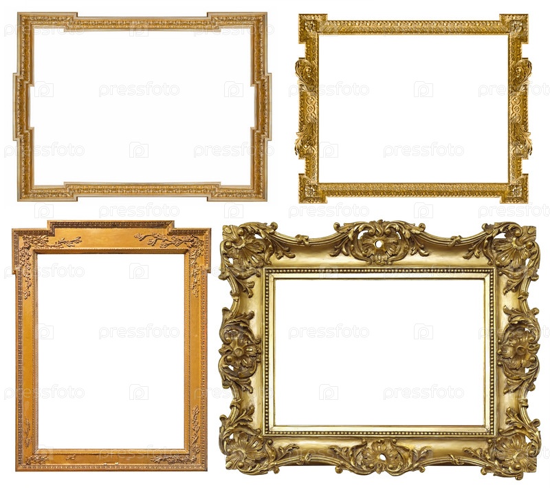 Набор золотых рамок для картин, зеркал или фотографий, изолированных на белом фоне