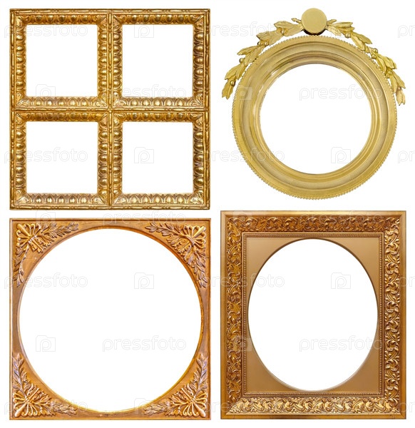 Набор золотых рамок для картин, зеркал или фотографий, изолированных на белом фоне