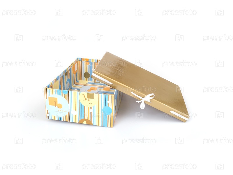 Один открытый подарок золотого цвета коробка с шелковой лентой изолирована на белом фоне