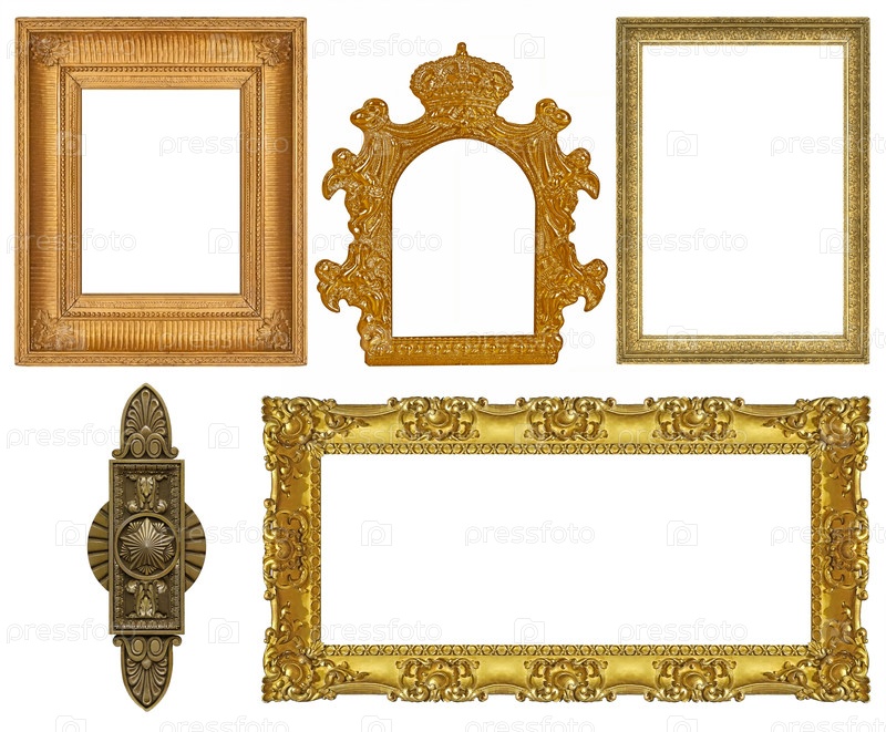 Набор золотых рамок для картин, зеркал или фотографий, изолированных на белом фоне