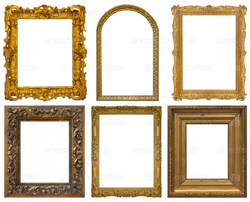 Набор золотых рамок для картин, зеркал или фотографий, изолированных на белом фоне