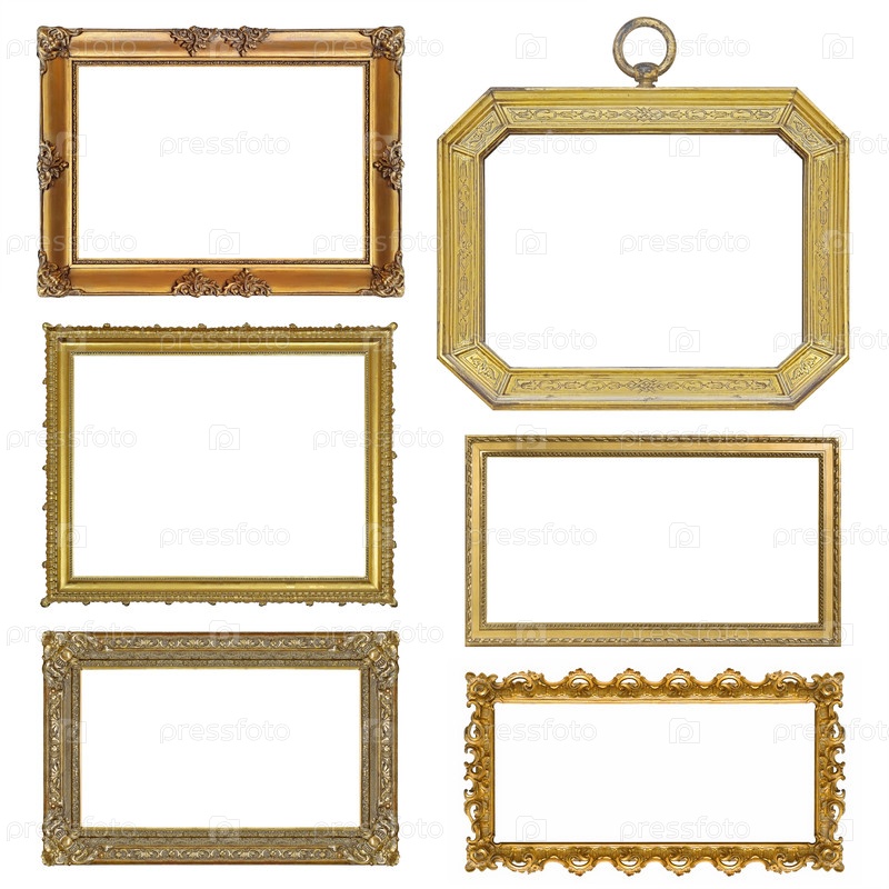 Набор золотых рамок для картин, зеркал или фотографий, изолированных на белом фоне