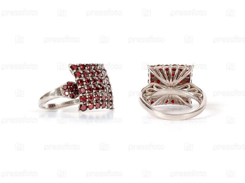 Красивое серебряное кольцо с природными гранатами, изолированными на белом фоне под разными углами