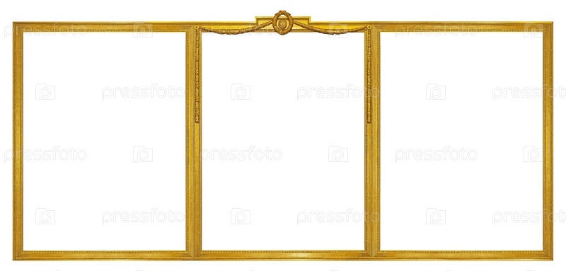 Тройной золотой каркас (триптих) для картин, зеркал или фотографий, выделенных на белом фоне. Элемент дизайна с обрезкой пути