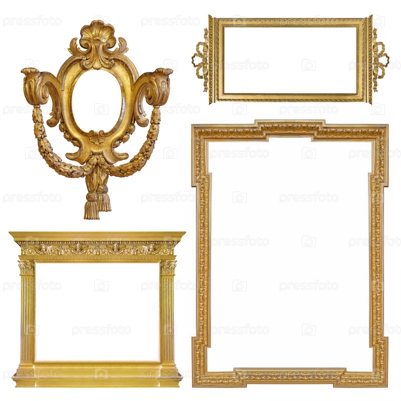 Набор золотых рамок для картин, зеркал или фотографий, изолированных на белом фоне
