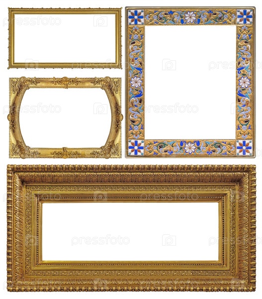 Набор золотых рамок для картин, зеркал или фотографий, изолированных на белом фоне