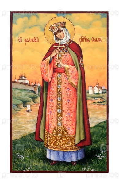 Иконный сувенир из Пскова (Россия). Русское название города означает на английском языке «Святая равноапостольная княгиня Ольга». Элемент дизайна с обрезкой пути