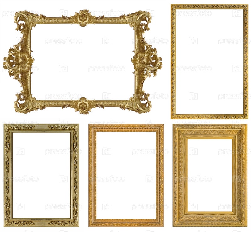 Набор золотых рамок для картин, зеркал или фотографий, изолированных на белом фоне