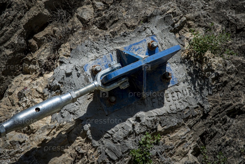 Прочный стальной анкер, закрепляющий скалистый рельеф для устойчивости конструкции