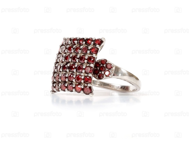 Красивое серебряное кольцо с природными гранатами, изолированными на белом фоне под разными углами
