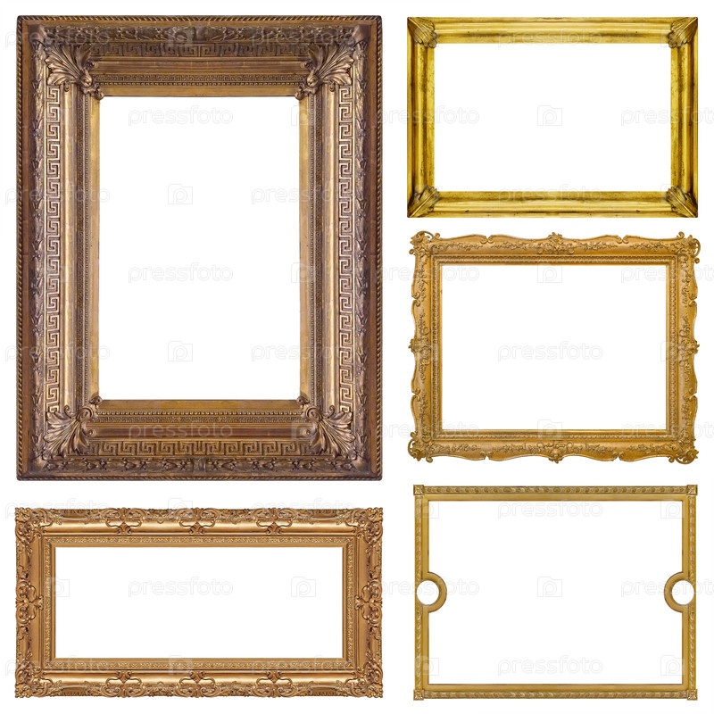 Набор золотых рамок для картин, зеркал или фотографий, изолированных на белом фоне