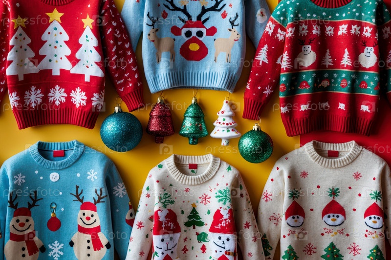 Забавные зимние свитера, висящие на стене, украшенные для празднования Рождества
