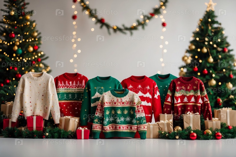 Забавные зимние свитера, висящие на стене, украшенные для празднования Рождества
