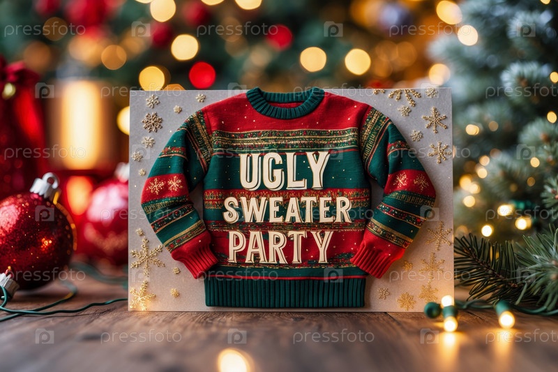Забавные зимние свитера, висящие на стене, украшенные для празднования Рождества