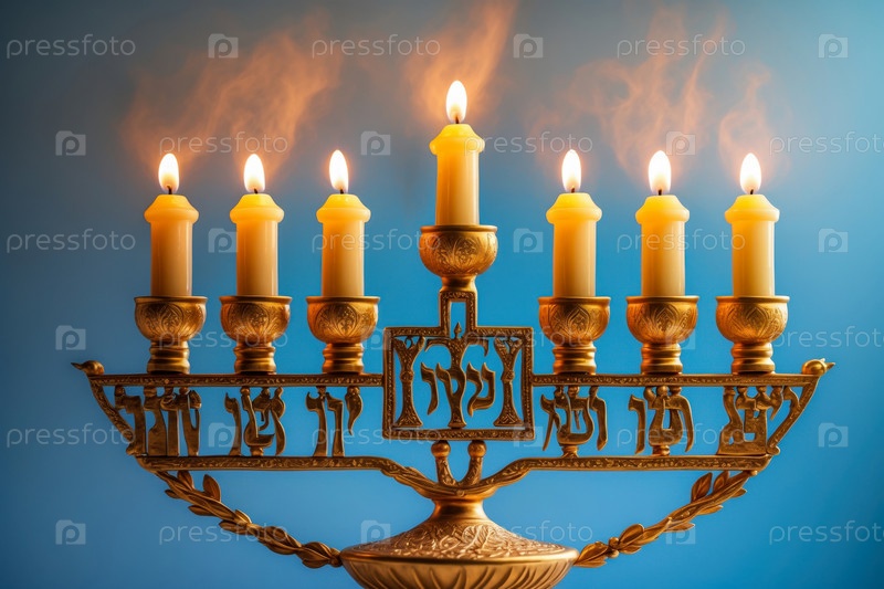 Менора со свечами на столе украшена Ханукой, еврейскими символами иудаизма в Израиле