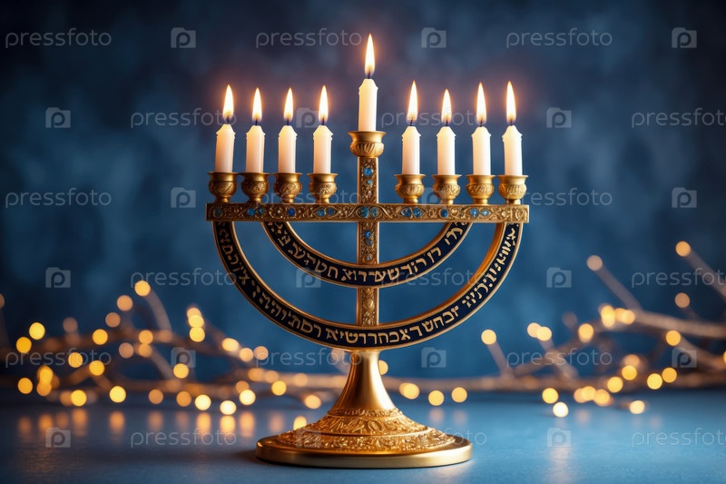 Менора со свечами на столе украшена Ханукой, еврейскими символами иудаизма в Израиле
