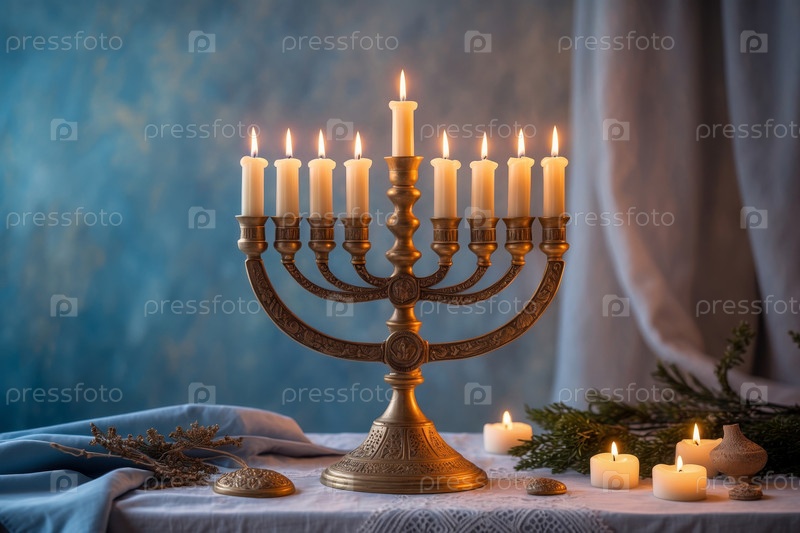 Менора со свечами на столе украшена Ханукой, еврейскими символами иудаизма в Израиле