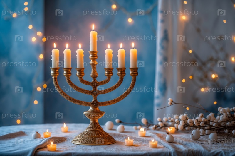Менора со свечами на столе украшена Ханукой, еврейскими символами иудаизма в Израиле