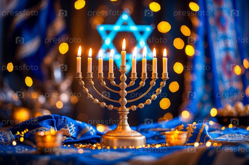 Менора со свечами на столе украшена Ханукой, еврейскими символами иудаизма в Израиле