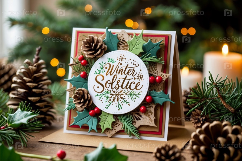 Зимнее солнцестояние поздравительная открытка на украшенном зимнем фоне еловых веток и шишек AI Generative