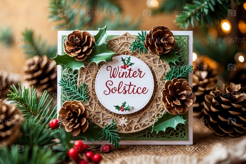 Зимнее солнцестояние поздравительная открытка на украшенном зимнем фоне еловых веток и шишек AI Generative