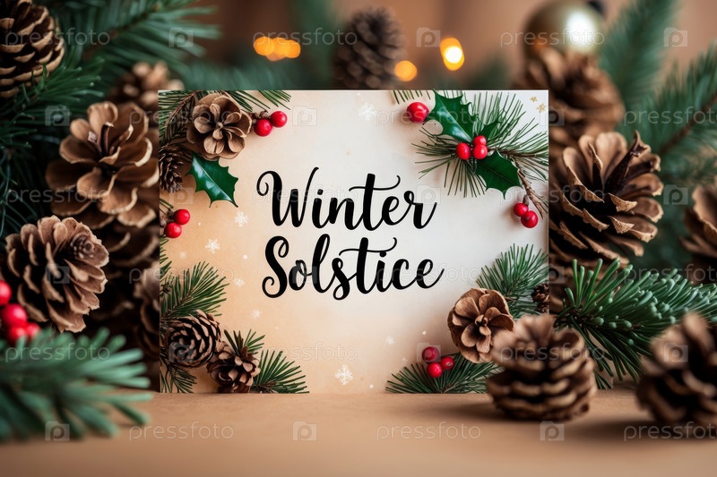 Зимнее солнцестояние поздравительная открытка на украшенном зимнем фоне еловых веток и шишек AI Generative