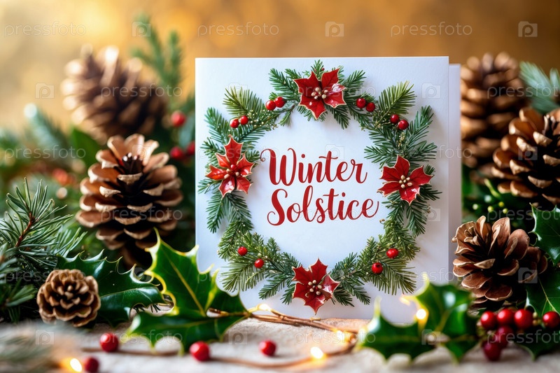 Зимнее солнцестояние поздравительная открытка на украшенном зимнем фоне еловых веток и шишек AI Generative