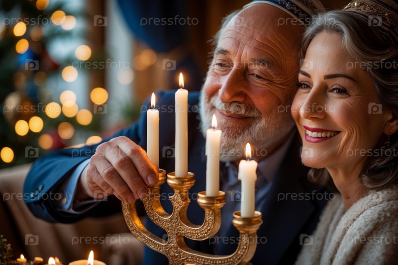 Старая супружеская пара празднует еврейский праздник Ханука муж и жена украшают менору AI Generative