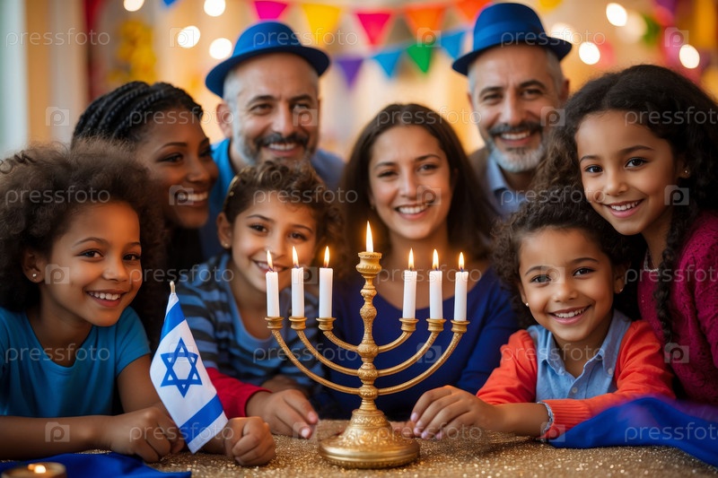 Большая еврейская семья празднует Хануку за обеденным столом, менору и свечи в Израиле