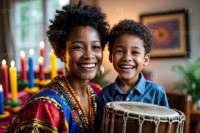 Генеративная афроамериканская семья мать и мальчик празднует культурный праздник Кванзаа в США