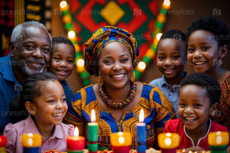 Большая афроамериканская семья празднует культурный праздник Кванзаа в США