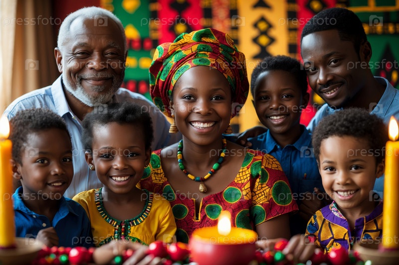 Большая афроамериканская семья празднует культурный праздник Кванзаа в США