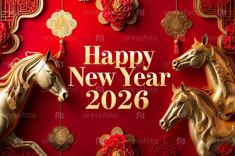 С Новым Годом 2026 года поздравительная открытка Карта с праздником Красной Лошади Символ Искусственный Интеллект