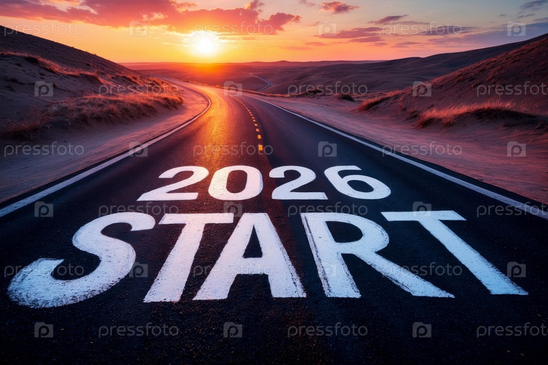 С Новым годом открытка Карточная надпись 2026 Старт на пустой шоссейной дороге AI Generative