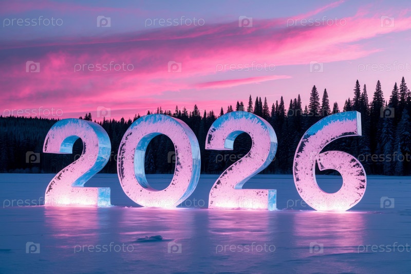 С новогодней поздравительной открыткой 2026 года, ледовые номера в снегу на фоне зимнего леса