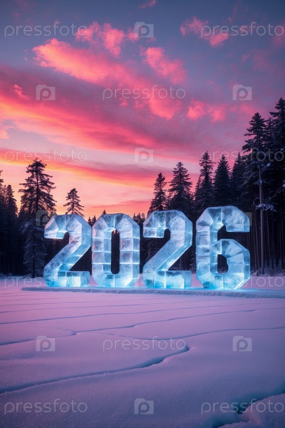 С новогодней поздравительной открыткой 2026 года, ледовые номера в снегу на фоне зимнего леса