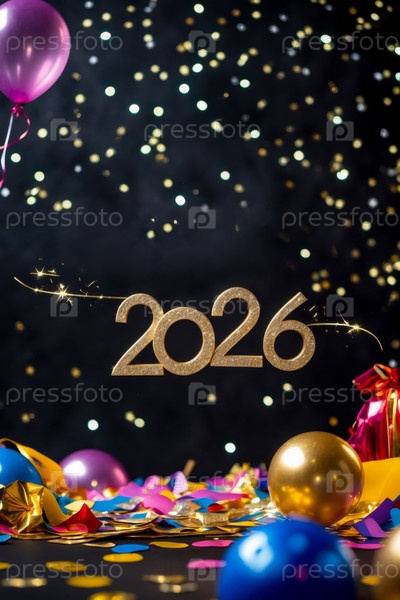 С Новым 2026 годом поздравительная открытка украшена цветными шариками и фейерверками