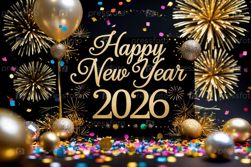 С Новым 2026 годом поздравительная открытка украшена цветными шариками и фейерверками