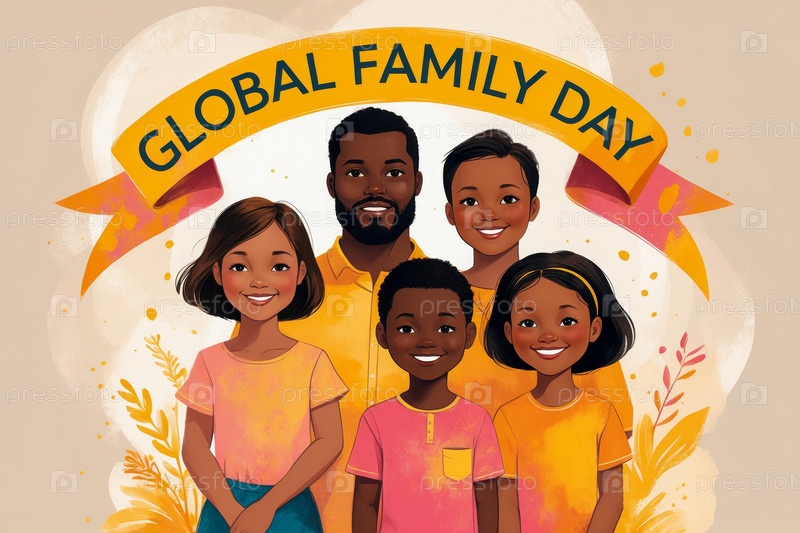 Поздравительная открытка с международным днем семьи, улыбающиеся счастливые люди, родители и дети